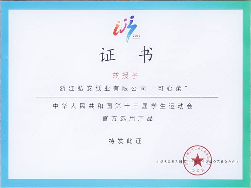 2017年9月4日中华人民共和国第十三届学生运动会在浙江杭州举行,可心柔携手中国邮政、中国平安、娃哈哈、京东校园、吉利汽车等知名企业品牌亮相大会。作为本次大会的12家合作单位之一,浙江开云官方站在线网站入口站登录-开云(中国)纸业有限公司参加了发布会,并接受了官方选用产品的授牌。