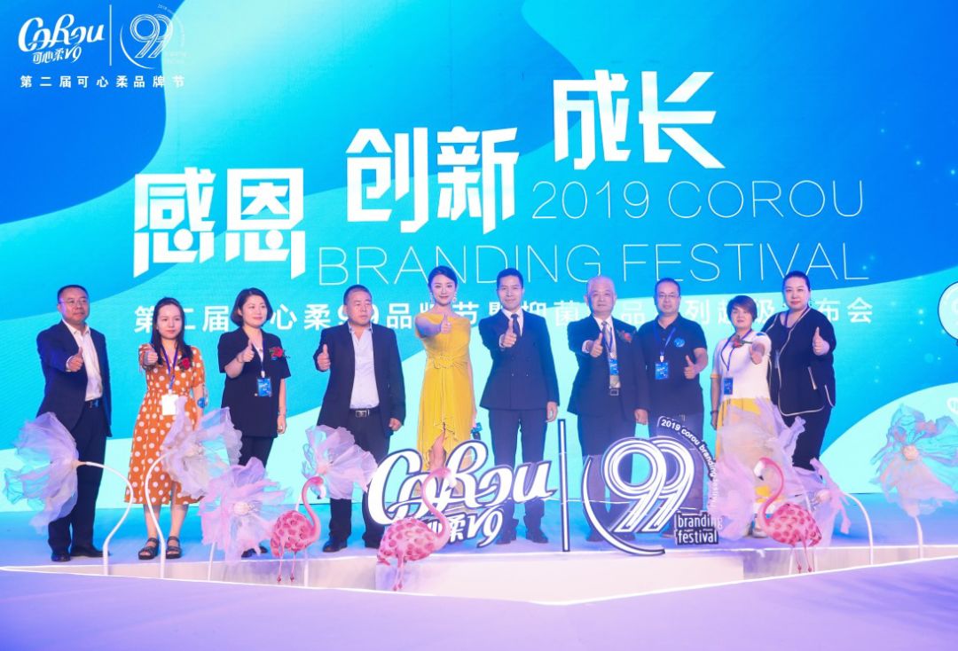 启动仪式环节,主持人伊一邀请曹振雷主任、陈少林董事长、卢道平营销总监等9位领导上台共同启动第二届可心柔9.9品牌节的序幕。